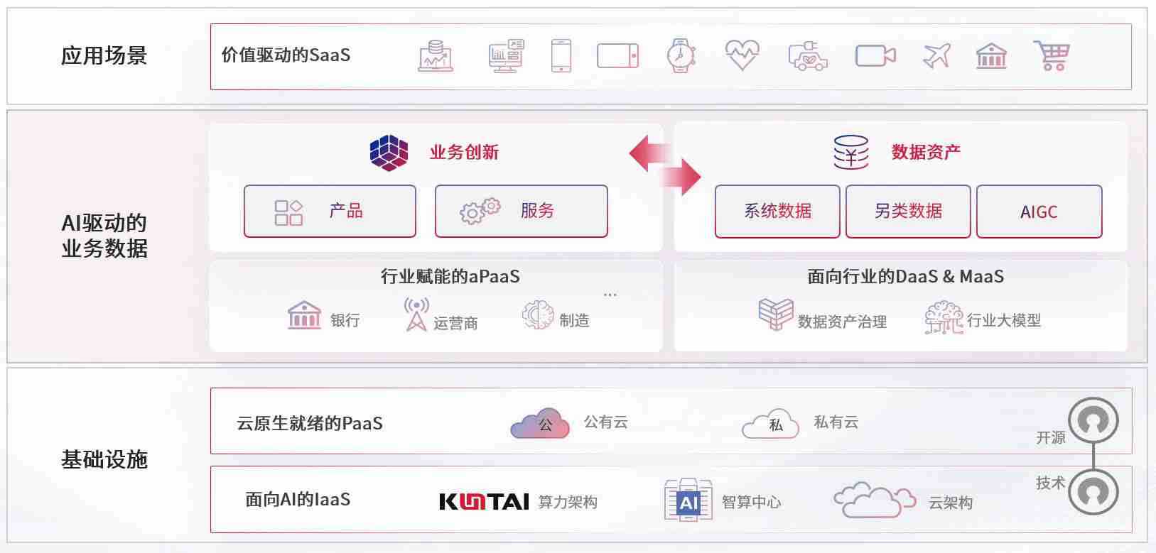 数字时代,,,围绕企业数字化转型的关键要素,,z6com尊龙凯时数码开创性的提出数云融合战略和技术体系框架,,,,着力在云原生、、、数字原生、、、、AI原生和信创产业上架构产品和服务能力,,,为处在不同数字化转型阶段的快消零售、、汽车、、、金融、、、医疗、、、政企、、教育、、、运营商等行业客户提供泛在的敏捷IT能力和融合的数据驱动能力,,,,构建跨界融合创新的数字业务场景和新业务模式,,助力企业级客户建立面向未来的核心能力和竞争优势,,,全面推动社会的数字化、、智能化转型升级。。
